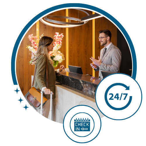 Check-in presenciais ou remotos com verificação de hóspedes e recolha de eventuais taxas ou upselling.